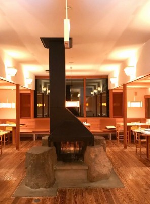 食堂には薪ストーブがあり現地に埋まっていた石材をデザインで4隅に配置されております