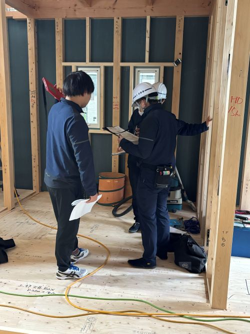 先日、上棟したばかりのお客様との現場でのスイッチ検査の際に、一足先に社内の検査員の方が構造検査に来られていました。